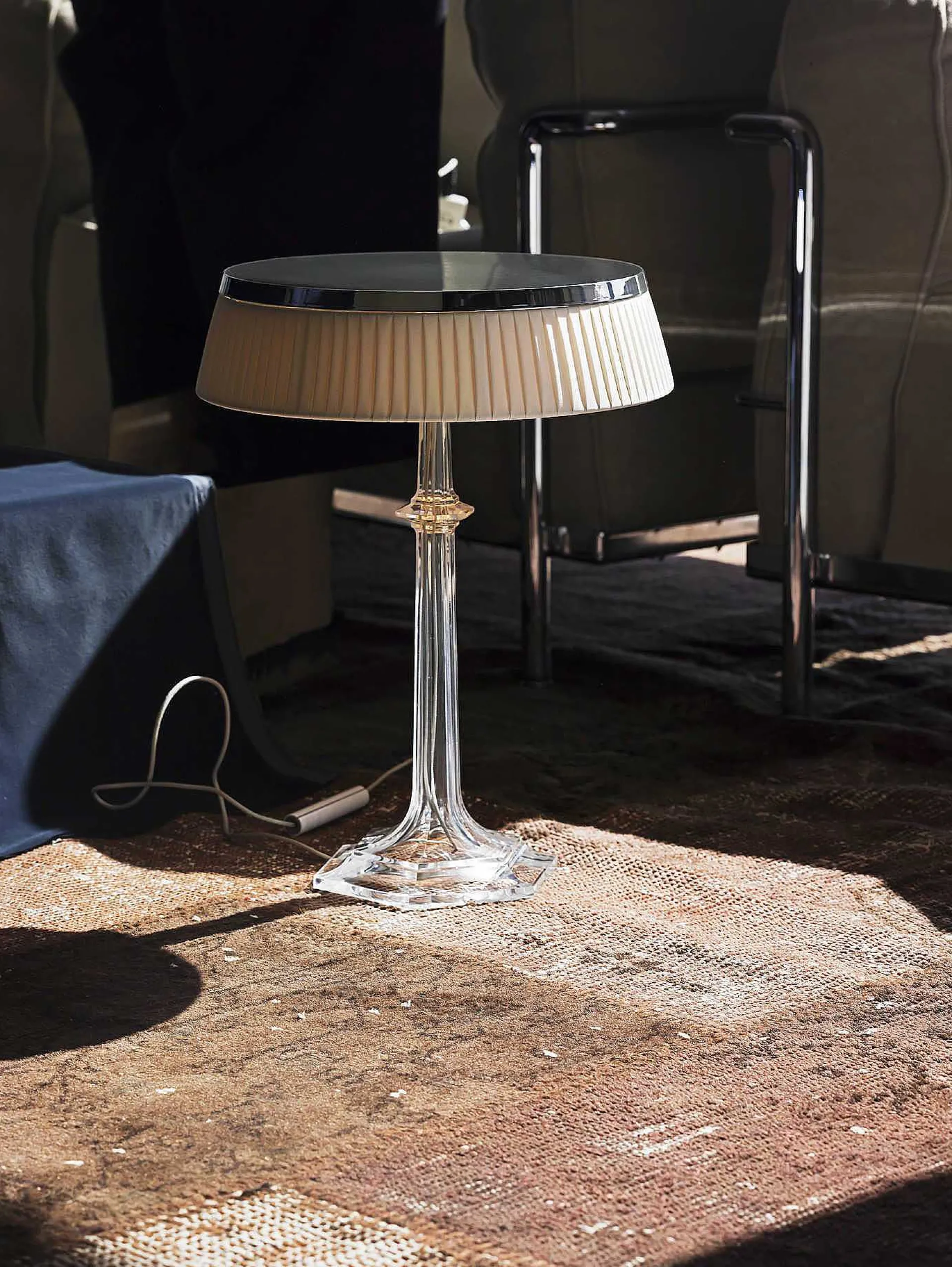 Bon Jour Versailles Designed By Philippe Starck Is The Heir Of The Bon Jour Lamp, Born From The Collaboration Between Flos And The Famous Designer, And Of The “Versailles” Candlestick Created By Baccarat. The Lamp Has A Base Whose Lines Recall The Most Famous Pieces Of The Maison Baccarat. Topped By A Chromed Top, The Lamp Features Unique And Innovative Led Edge Lighting Technology, Developed By Flos, Which Together With An Elegant Lampshade In Pleated Fabric, Allows To Diffuse A Warm And Homogeneous Light. Composed Of Two Models, In Crystal Or Polymethylmethacrylate, And Available In Two Different Sizes, This Fascinating Lamp Reveals Timeless Light Lines, A Sign Of Tangible Modernity, Which Evoke The Collective Memory Of The Past, Present And Future.